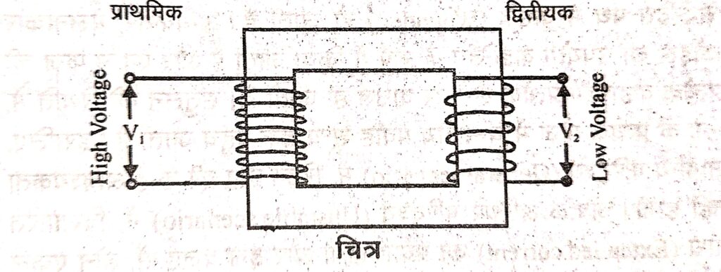 (b) अपचायी परिणामित्र (Step down Transformer) – इसमें प्राथमिक कुण्डली में अधिक वोल्टेज दिया जाता है तो द्वितीयक कुण्डली में कम वोल्टेज प्राप्त होता है। यह प्राथमिक कुण्डली में द्वितीयक कुण्डली से फेरों की संख्या अधिक होने की वजह से होता है।