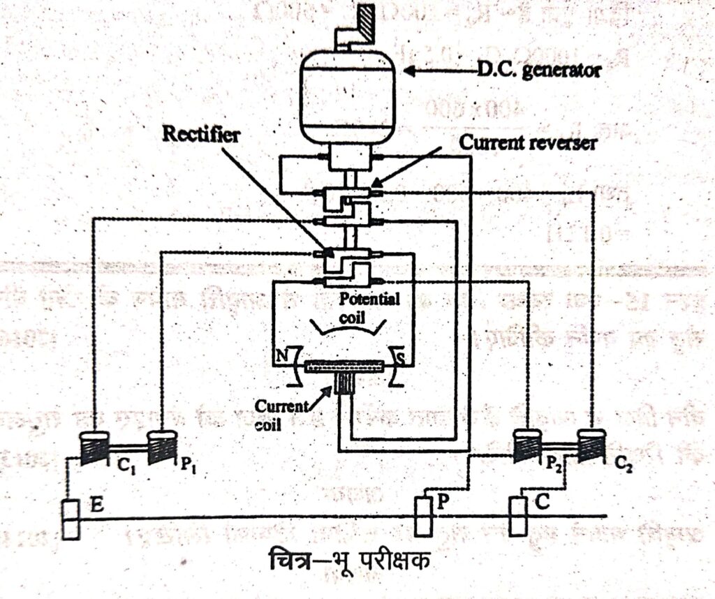 भू-परीक्षक अर्थ इलेक्ट्रॉड द्वारा भूमि में प्रत्यावर्ती धारा भेजता है जब शेष परिपथ में दिष्ट धारा प्रवाहित होती है तो भू-परीक्षक अर्थ इलेक्ट्रॉड द्वारा भूमि में प्रत्यावर्ती धारा भेजता है। भू-प्रतिरोध का मान ज्ञात करने के लिए दिष्ट धारा जनित्र को एक स्थिर (constant) गति से घुमाया जाता है जब कि संकेतक एक स्थिर पाठ्यांक नहीं देता है।