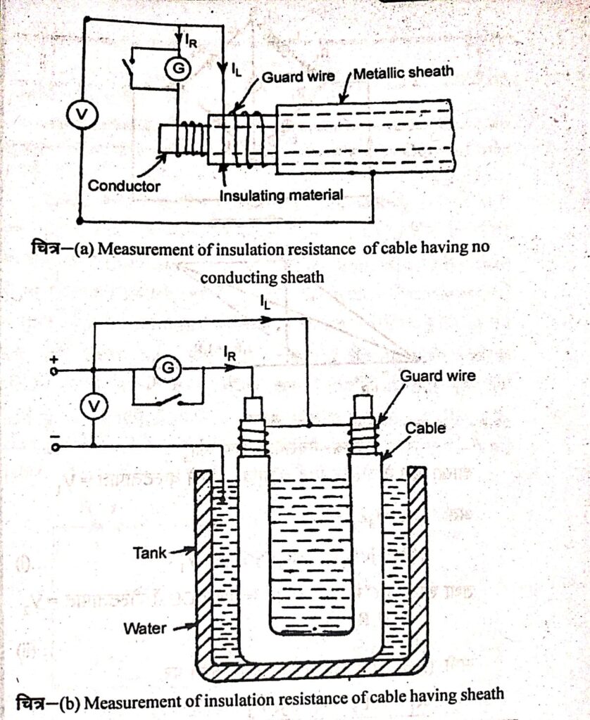चित्रानुसार केबिल के insulation resistance को मापने के लिए सीधे विक्षेप विधि को दर्शाया गया है। गैल्वेनोमीटर G, चालक तथा metal sheath के मध्य धारा को मापता है। लीकेज धारा guard wire द्वारा carry की जाती है, जो insulation पर लिपटा हुआ है तथा इसलिए यह गैल्वेनोमीटर में से प्रवाहित नहीं होती है।