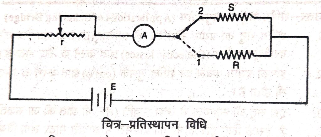 चित्र में प्रतिस्थापनविधि का परिपथ दर्शाया गया है जिसमें R अज्ञात प्रतिरोध है जबकि S एक मानक परिवर्ती प्रतिरोध है। A एक अमीटर है और एक regulating प्रतिरोध है। एक स्विच की सहायता से R तथा S को बारी-बारी से परिपथ में जोड़ा जाता है।